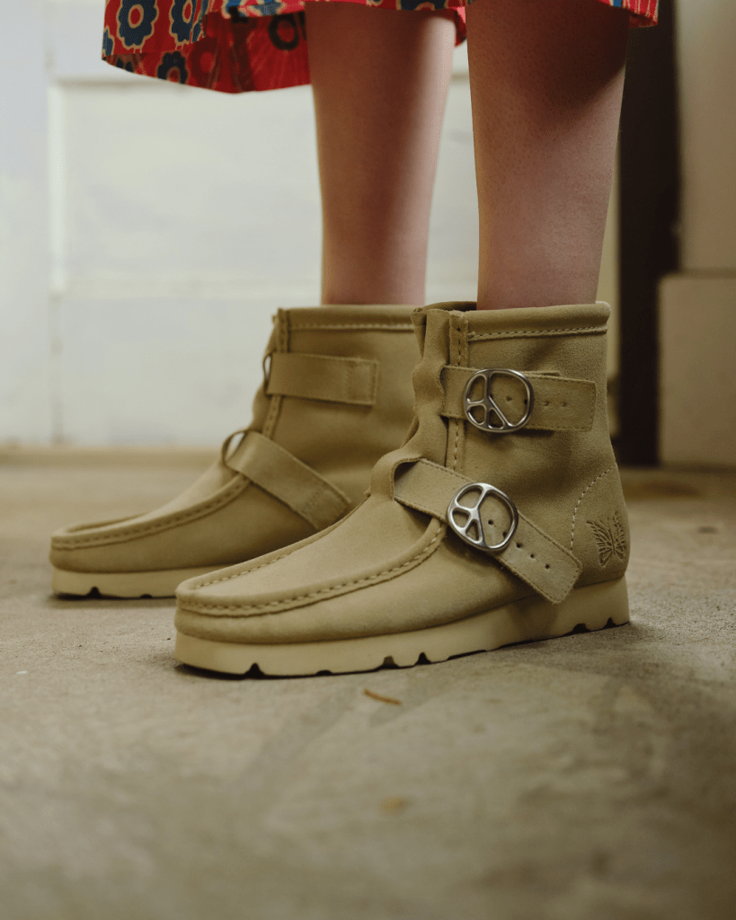 Clarks blijft verrassen en tekende voor het eerst een samenwerking met het Japanse merk Needles. De Wallabee krijgt hier een minimalistische make-over in twee kleuren en drie hoogtes (laag, mid en boot). Details zoals het vlinderlogo en de peace sign-gesp zijn subtiel maar geladen met betekenis.