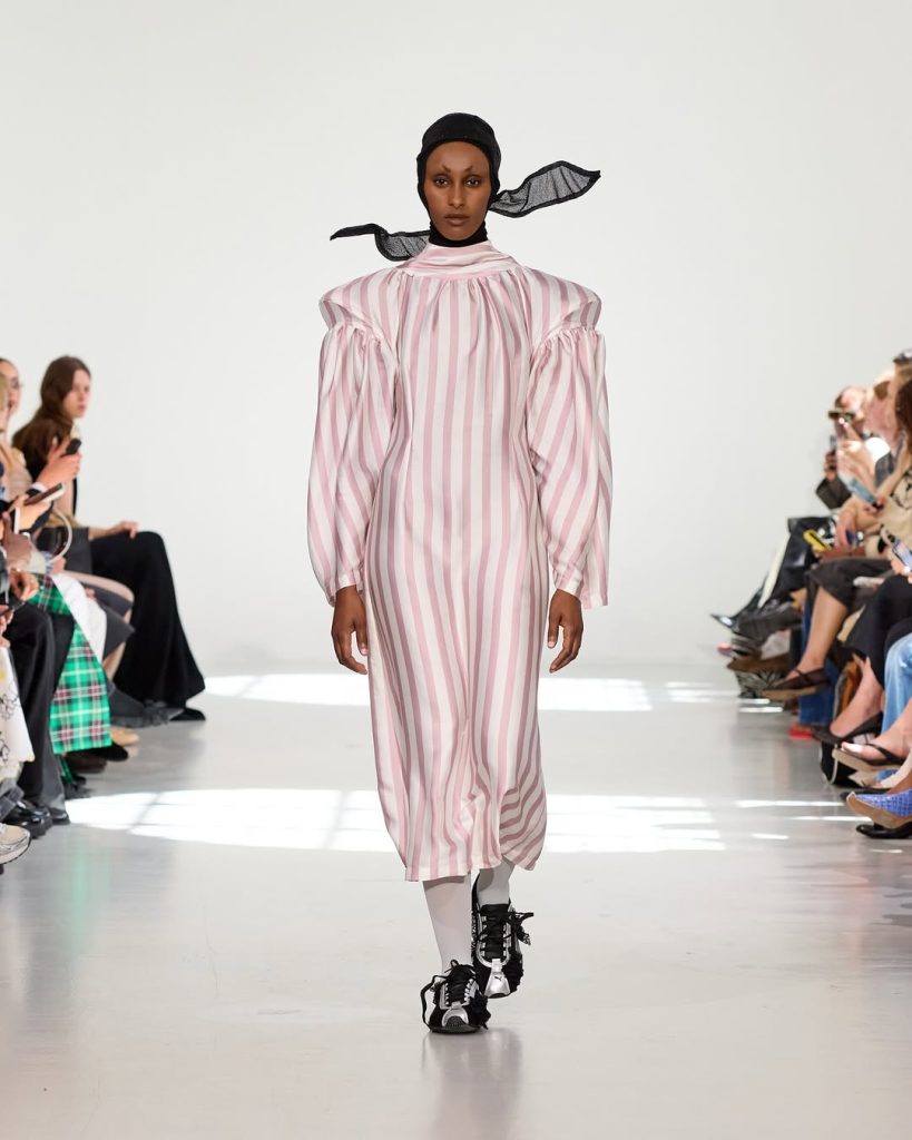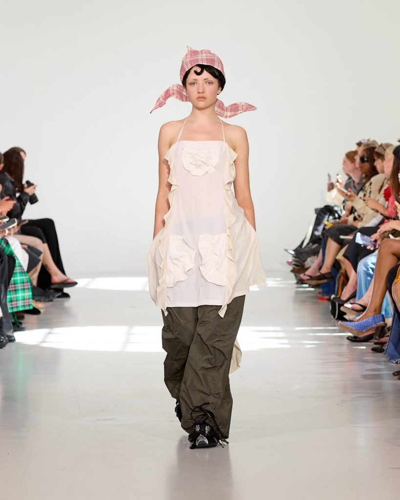 Aan de voeten dragen de modellen Puma-sneakers versierd met strikken, terwijl sommige rokken voorzien zijn van zichtbare baleinen, wat het idee van transparantie in het creatieproces versterkt. Schouders zijn soms gewatteerd, soms nonchalant afhangend, waarmee het duo bewust het ‘achter de schermen’-gevoel oproept. Een poëtische garderobe, ruw en zelfbewust.