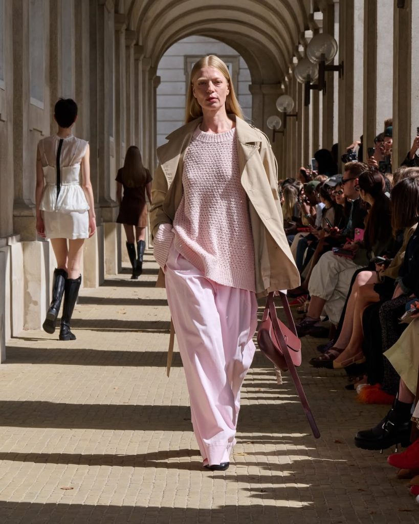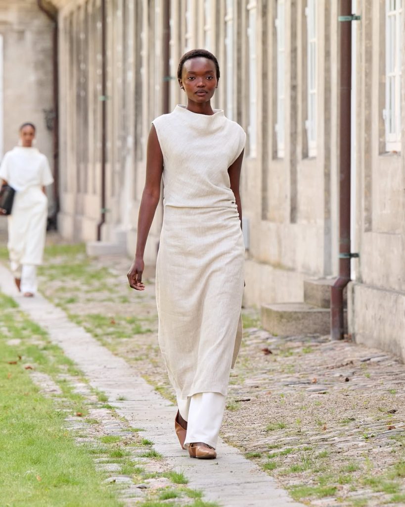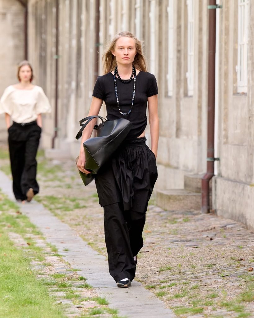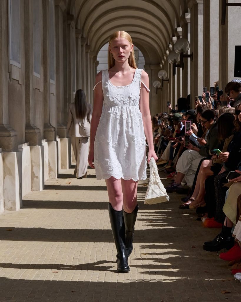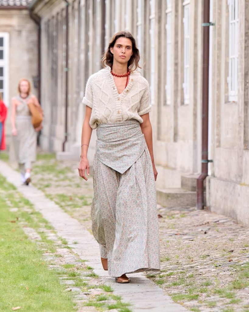 Hier primeert vloeiendheid: 33 silhouetten met pure lijnen, in neutrale tinten, doorbroken met accenten van rood. De landelijke esthetiek — jurken met ruches, hoofddoeken om het hoofd of de taille — verschuift langzaam naar een stedelijker, donkerder voorstel, waar soepel denim samengaat met ruime shoppers in leerlook.