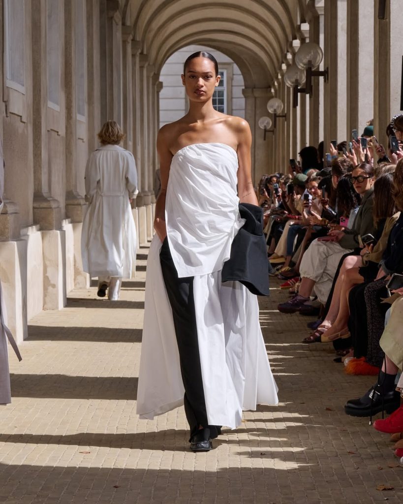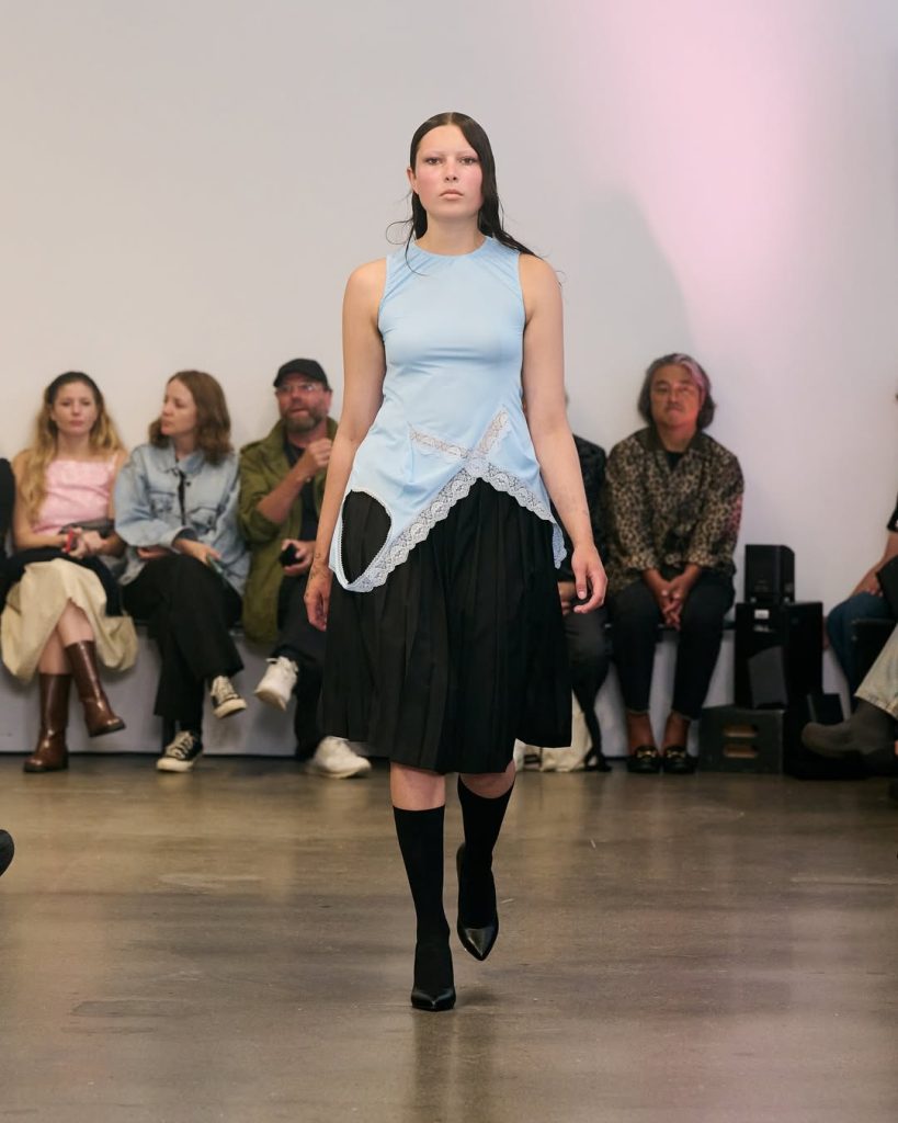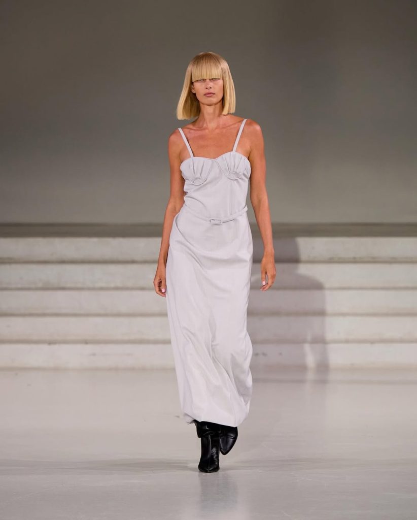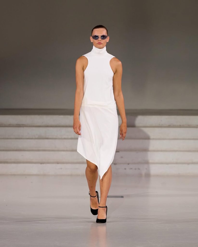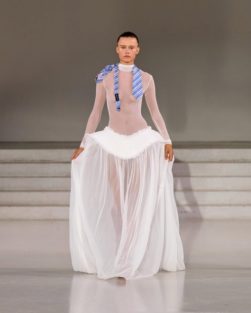 De collectie, ontworpen als een garderobe om je eigen te maken, speelt in op personalisatie. Van de 30 getoonde looks vallen sommige op door de hoekige coupe die de blik maskeert, andere door hun uitgesproken 90’s-esthetiek: een mouwloze coltrui en ovale, getinte zonnebrillen. De textuurdetails — vooral op jurken en bralettes — doen denken aan de ruwheid van een schelp, wat het vloeibare karakter van het geheel versterkt. Het slotbeeld spreekt boekdelen: een deels transparante jurk, gestructureerd als een tutu, accentueert de heupen als een kwal in beweging.