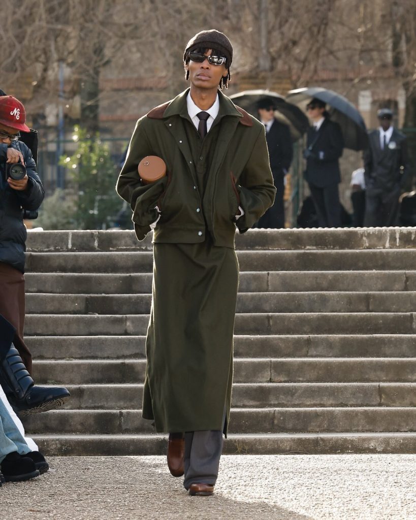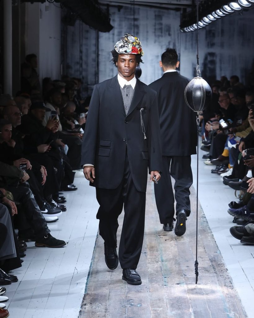 Yohji Yamamoto sluit af met een radicaal andere en bijna post apocalyptische visie. De silhouetten camoufleren zich, beschermen zich en wikkelen zich in lagen. Hoeden gemaakt van flessendoppen, officiersjassen die flirten met camouflageprints en omgeleide accessoires dragen een onderliggende thematiek van overleving. Een sterk moment van deze Fashion Week is de aanwezigheid van de Frans Congolese rapper Jolagreen die twee keer de catwalk betreedt en de show afsluit. Hij belichaamt een meervoudige mannelijkheid op het kruispunt van tijdperken en identiteiten.