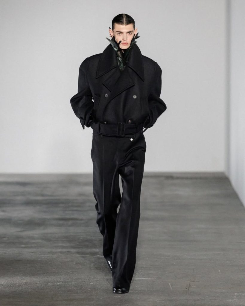 Deze Parijse editie valt ook op door een uitgesproken chromatische vrijheid. Bij EGONLAB nemen veren de plaats in van hemden. Ze sluiten aan op het lichaam en verschijnen in heldere, vibrerende tinten. De kille en monochrome silhouetten maken plaats voor een expressieve en bijna gevoelige vorm van mannelijkheid waarin kleur en materiaal een eigen taal spreken.