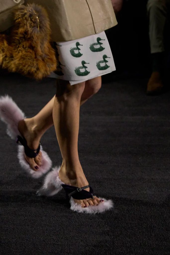 Het begin van de jaren tien markeert een keerpunt. De lente collectie van 2013 bij Céline introduceert donzige mules geïnspireerd op Minnie slippers. Enkele seizoenen later blaast Jonathan Anderson bij Loewe het concept nieuw leven in met overdreven volumes en fantasierijke texturen, waardoor fuzzy shoes een bijna hypermodieuze status krijgen. Sindsdien zijn ze vaste gasten op de catwalks van Burberry, Christopher Esber, Gucci, Ferragamo en Maison Margiela.