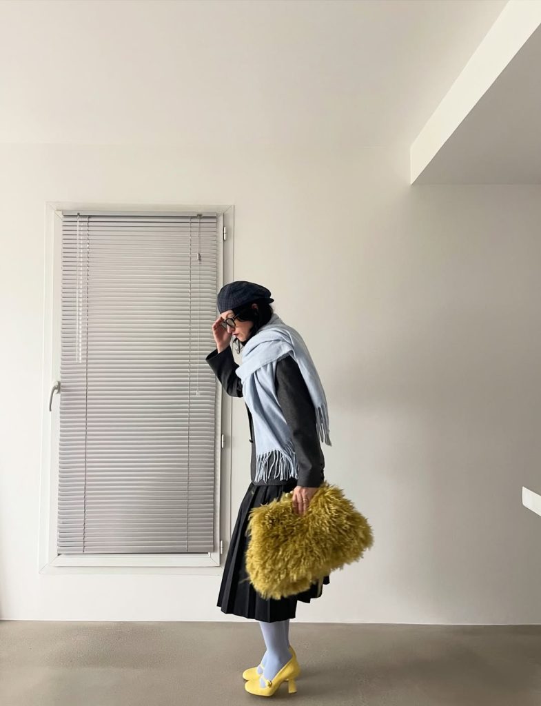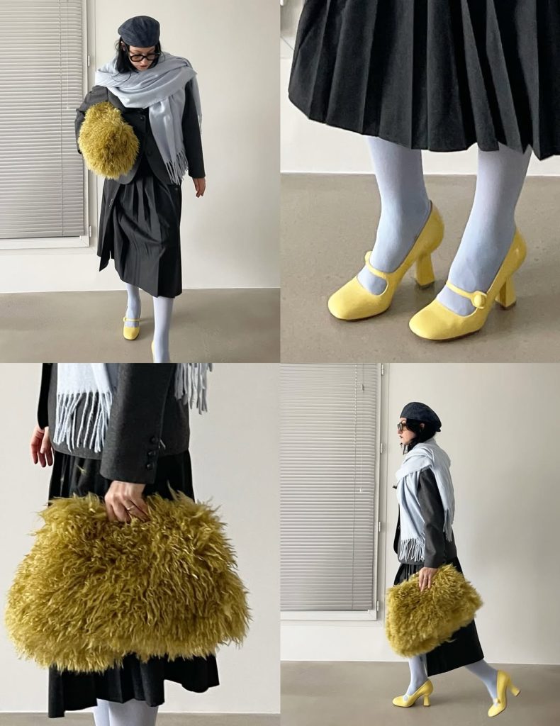 Yeti boots, volumineus en omhullend, worden gedragen met een rok of jurk om contrast te creëren en tegelijk een uitgesproken Y2K esthetiek te omarmen. Harige pumps, eleganter en meer gestructureerd, zorgen voor een onverwachte twist. Onder een pantalon of een aansluitende jeans transformeren ze een klassiek ensemble tot een bewust eigenzinnige look. Zelfs ballerina’s, lange tijd het symbool van soberheid, worden heruitgevonden in fuzzy uitvoering. Ze groeien uit tot echte winter signatures, perfect te combineren met een ondoorzichtige panty of een paar statement sokken om te spelen met lagen en texturen.