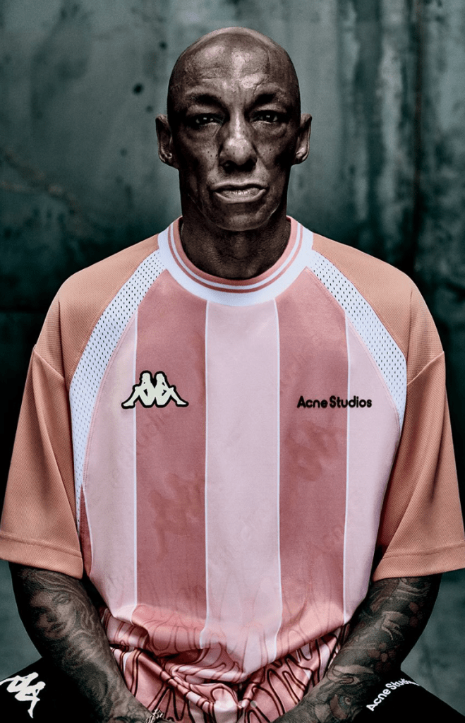 Dat de trend onverminderd populair blijft, blijkt uit de samenwerking tussen Acne Studios en het iconische Italiaanse merk Kappa — bekend als de eerste sponsor van een voetbalclub, Juventus FC in 1979. De capsulecollectie van zo’n vijftien stuks sluit aan bij de “bloke-core”-esthetiek, geïnspireerd op de looks van Britse voetbalfans.