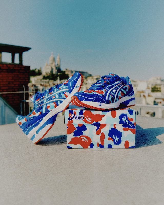 Niet verrassend is de sneaker voorzien van Bape’s beroemde camouflage. Verschillende tinten blauw, rood en wit sieren de vorm van het paar, dat een Franse exclusiviteit is. De BAPE x Asics-samenwerking zal in zeer beperkte hoeveelheden verkrijgbaar zijn in de Parijse winkel in het 4e arrondissement, op de website bapefrance.com en in de BAPE®-hoek in de Galeries Lafayette op de Champs-Elysées, voor een prijs van 140€.