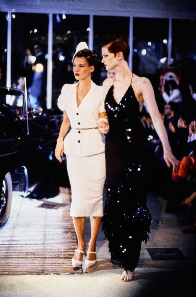 De collectie, gepresenteerd in de lente/zomer van 1995 in Parijs en al snel « Pin-Up » genoemd, opent in een chaotische sfeer. Twee uur vertraging, een ongeduldig publiek, Madonna die opstapt — maar de impact is zo groot dat ze later een look uit de show opnieuw draagt in Take a Bow. Een bewijs dat Galliano’s creatieve visie de kern raakte, ondanks de omstandigheden.