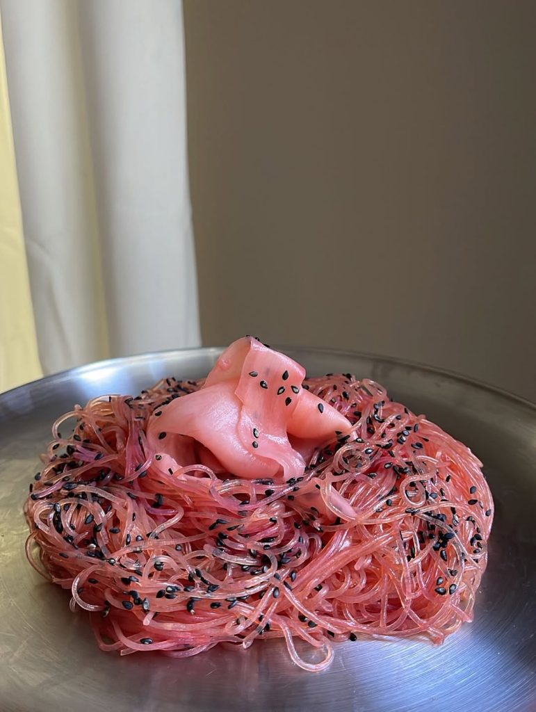 In de Verenigde Staten gaat Brianna Hollingsworth, bekend als Matrixxgirl, nog een stap verder met een esthetiek die bijna couture aanvoelt. Haar credo “Turning runway into exquisite dishes” laat er geen twijfel over bestaan. Ze wil silhouetten van de catwalk vertalen naar culinaire creaties. Anders dan Roxane Trady die haar outfits afstemt op haar gerechten, vertrekt Brianna vanuit statement pieces uit haar garderobe of looks rechtstreeks van de runway en creëert vervolgens borden die dezelfde kleuren, volumes of texturen weerspiegelen. Bij haar verandert een roze satijnen pak van Matières Fécales in een rozenvormig dessert, een Moschino stippenjurk in een bord pasta en Margiela tabi ballerina’s in een chocolade taart.