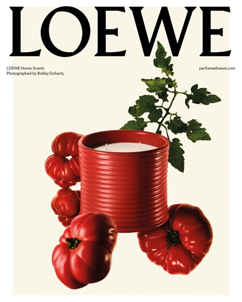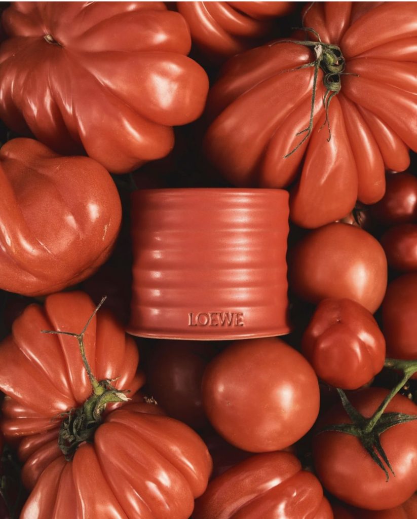 Onder de meest emblematische creaties neemt de tomatenblad-kaars een bijzondere plaats in. Geïnspireerd op de groene, frisse en lichtzure geur van tomatenplanten, belichaamt ze de intieme band die het huis met deze vrucht onderhoudt. De coeur de boeuf-tomaat, vlezig en bijna barok in haar vormen, werd ooit zelfs als “typisch Loewe” bestempeld in een virale tweet. Een knipoog die het huis wist om te buigen tot een communicatietool, door later een reeks accessoires in de vorm van de vrucht te lanceren – het bewijs dat bij Loewe olfactorische inspiratie moeiteloos alle creatieve domeinen kan besmetten.