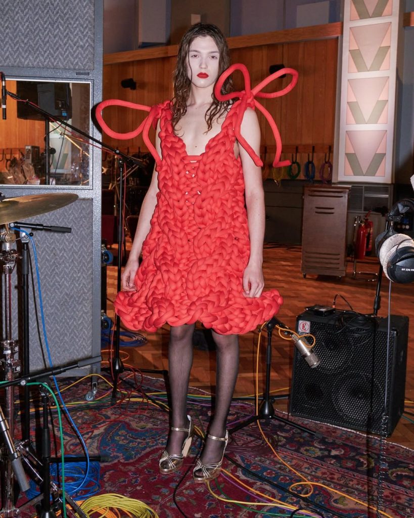 Op de runway toont ze een mannelijkheid in transitie: microshorts en voetbalkousen, krullen met een jaren 80-feel. De accessoires herdefiniëren het alledaagse — bruine papieren zakken gedeeld door twee modellen suggereren tegelijkertijd de klant en de koerier; vintage Nike Shox; voetbalshirts met ruches en puntige pumps. Een cast tussen street en droom.