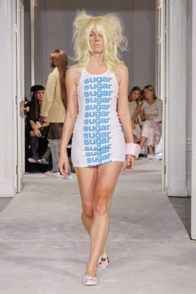 Accessoires speels verdraaid: wc-papierrollen als XXL-armbanden, schoenriemen als ceintures, volumineuze grijze pruiken en pleisters op de knieën om het beeld te vervolmaken. Daarbovenop een kinderlijke gelaagdheid: een kat in een mand gedrukt op een body, mini-lijstjes in zakken geschoven en megalomane slogans als I Love Me. Een samenwerking met sieradenlabel Yvmin zou dit uitbundig kitsch-DNA zomaar kunnen verlengen.