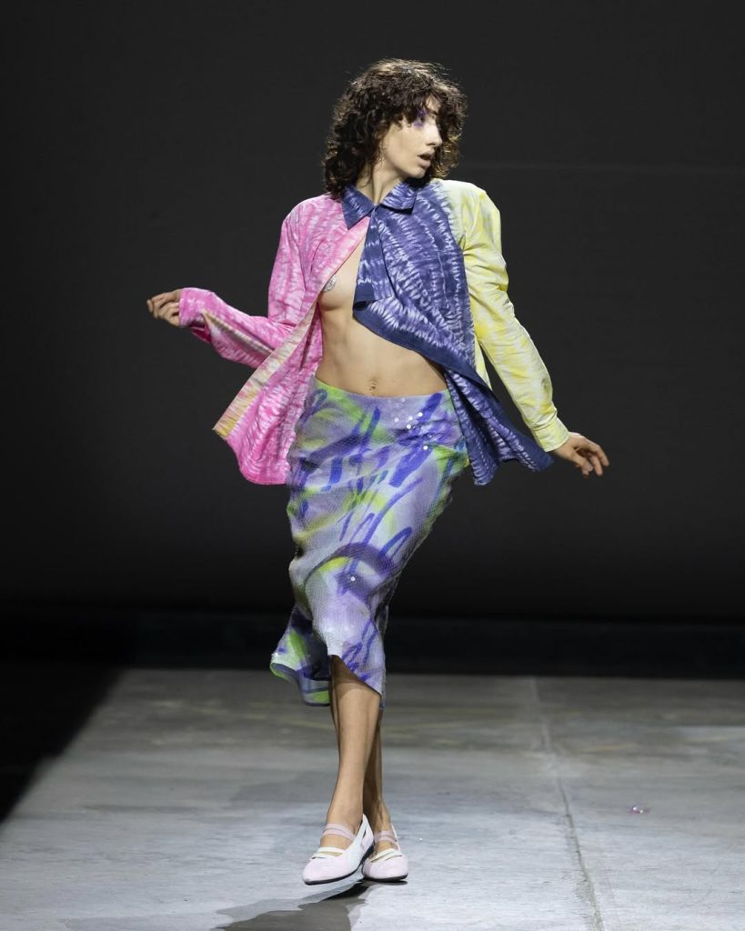 Een kleurrijke ode aan de popcultuur en haar iconen uit de jaren 80. Op de catwalk: felle tinten — appelgroen, fuchsia, neonoranje — gecombineerd met shape-wear panty’s, oversized zonnebrillen, franjes die doen denken aan pareo’s of jurken met een vissenschub-effect. Trouw aan zijn eco-verantwoord engagement blijft Ives upcycling als leidraad nemen.