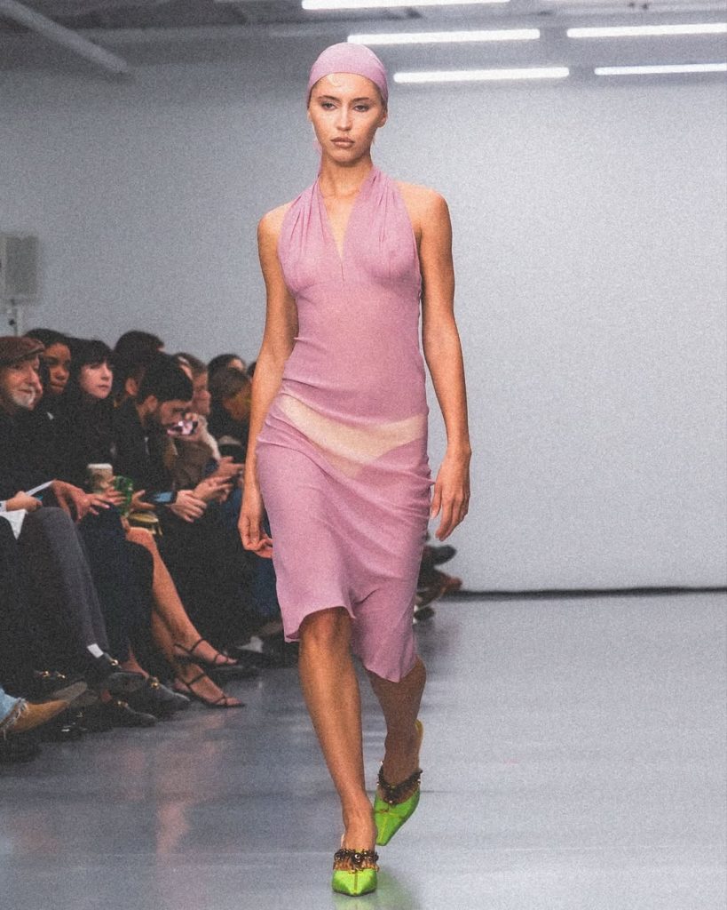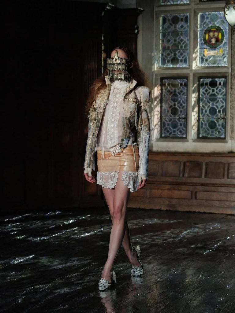 De collectie grijpt terug naar de garderobe van grootmoeders: bloemige blouses, orthopedische schoenen getransformeerd tot hybride ugly heels, nachtjaponnen met ruches. Alles lijkt te stammen uit een herkenbaar verleden, heruitgevonden door een maximalistische en kitscherige lens.
