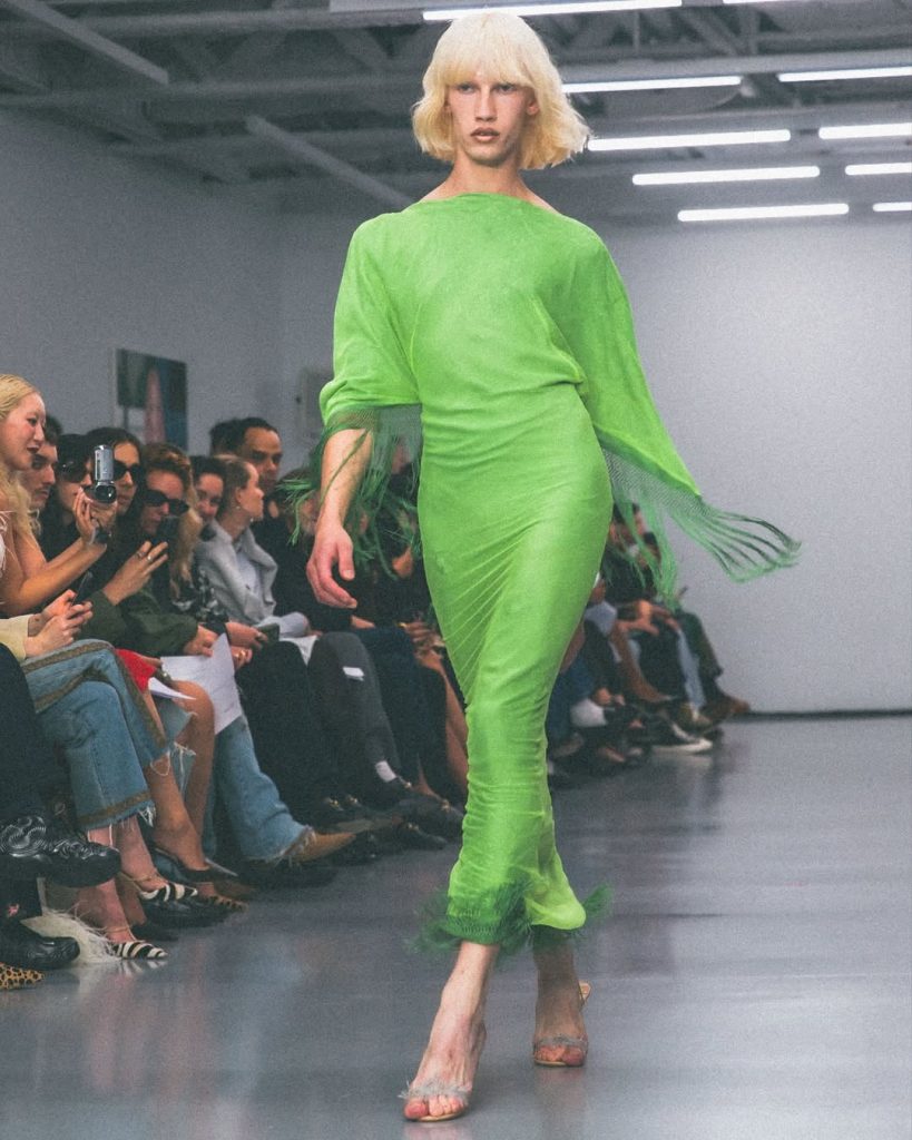 Bekend geworden toen hij Adwoa Aboah voor het Met Gala kleedde terwijl hij nog student was, baant Conner Ives zich gestaag een weg in de modewereld. De Amerikaanse ontwerper, gevestigd in Londen, presenteerde deze keer de collectie ‘On Pop’ met het motto: ‘Pop music will never be low brow’.