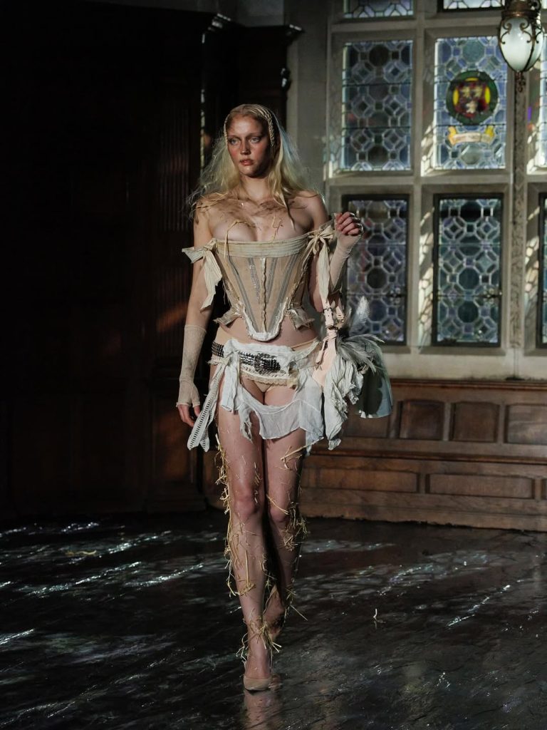 De collectie, balancerend tussen gotiek en victoriaans, slaat echter een commerciëler pad in: het eeuwige zwart maakt plaats voor rood, wit en beige. De esthetiek blijft radicaal, maar wordt toegankelijker, zonder haar symbolische kracht te verliezen.