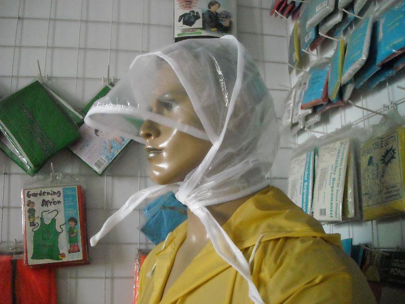 Nog een erfstuk van grootmoeders garderobe is de transparante kap die vaak met stippen of in kleur voorkomt en die je voor bijna niets op een markt vindt. Ze is bijzonder praktisch, beschermt tegen wind en regen en laat de handen vrij in tegenstelling tot een paraplu.