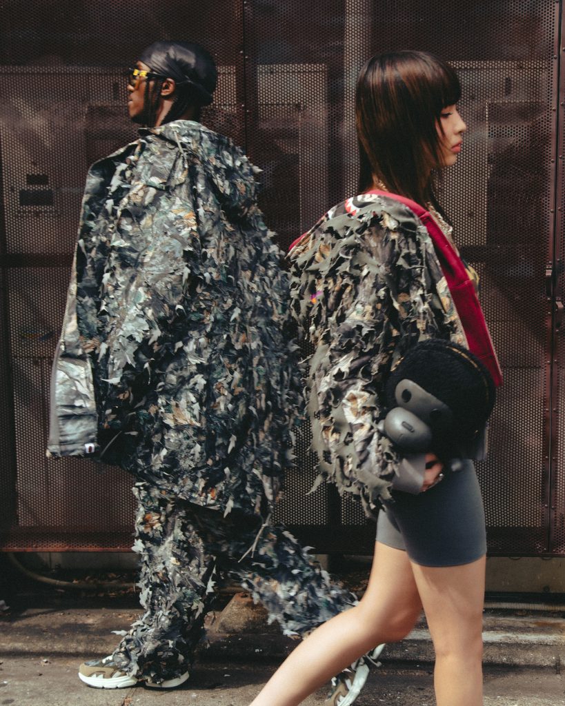 Onder de opvallendste stukken: militaire jassen met 3D-lasergesneden BAPE STA™-motieven, technische cargo’s, en de grote terugkeer van de legendarische Shark Full Zip Hoodie in een Tree Edge Camo-versie met aardetinten. Ook nieuw: het Cloud Camo-motief, in indigo-geverfde denim met verfijnde Sashiko-borduursels — een Japanse ambachtelijke techniek.