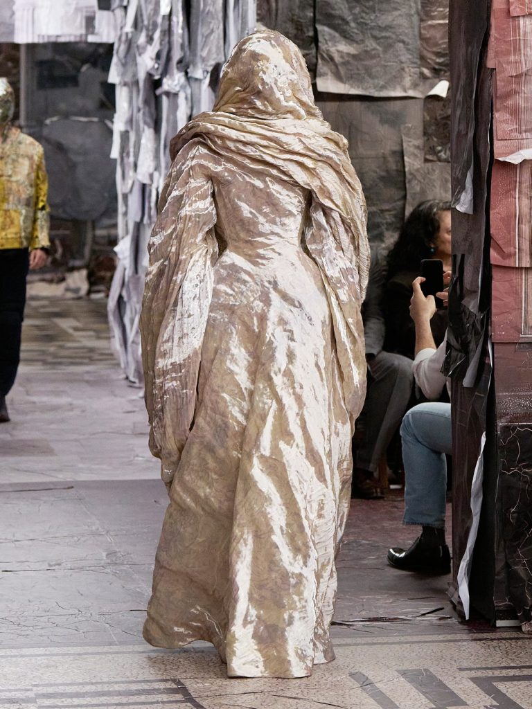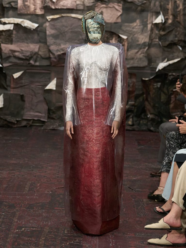 Martens kiest ervoor om dat spel niet mee te spelen. In plaats van te wedijveren, kiest hij voor terughoudendheid — en laat zo de kleding spreken. De modellen zijn volledig gemaskeerd. Een radicaal gebaar dat onmiddellijk verwijst naar het DNA van het huis. Reeds in 1989 gebruikte Martin Margiela maskers om de aandacht op het kledingstuk te houden. Deze keuze is dus allesbehalve willekeurig. Door gezichten uit te wissen, maakt Glenn Martens een dubbel statement: tegen de extreme personificatie van Galliano — waarin elk model een personage werd — én tegen de huidige castings, waarin steeds dezelfde gezichten de creaties overschaduwen. Hier is het kledingstuk de ster. Punt. Met 49 spookachtige silhouetten componeert Martens een bevreemdende, bijna onwerkelijke parade waarin elke outfit lijkt te zweven in de ruimte.