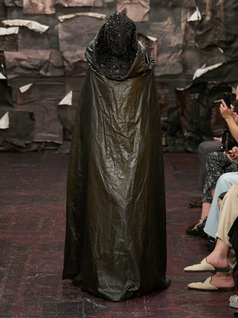 Vanaf de eerste minuut is de toon gezet: de openingslooks zijn nog verpakt in plastic, alsof ze wachten om onthuld te worden. Onder het doorschijnende materiaal regeert de transparantie. De kleding slaapt nog — is eerder voelbaar dan zichtbaar. Een doorgetrokken metafoor voor het huis zelf, dat in volle transformatie verkeert.