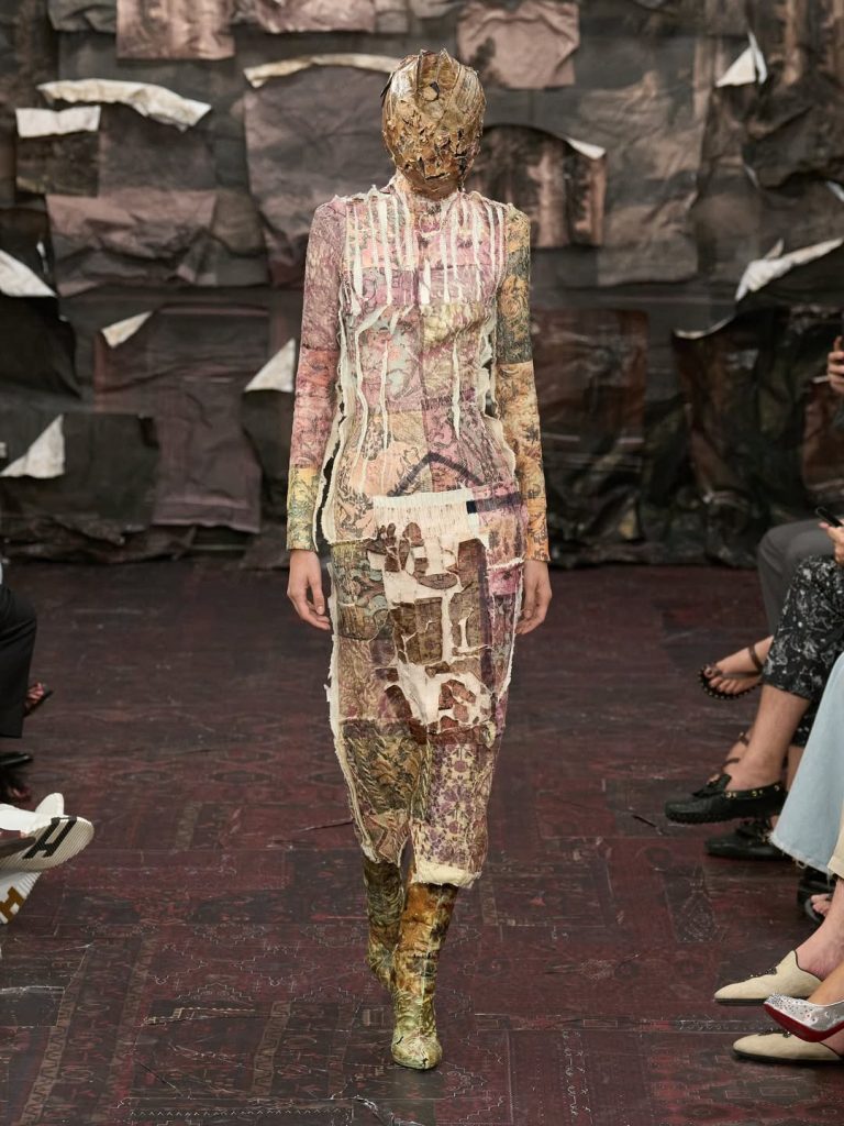 Om zijn visie als hoofd van Maison Margiela te markeren, koos Glenn Martens ervoor om terug te reizen in de tijd. Hij dook diep in het archief van het huis en distilleerde fragmenten uit verschillende tijdperken om een gelaagde, bijna anachronistische collectie te creëren waarin het verleden en het heden met elkaar in dialoog gaan.