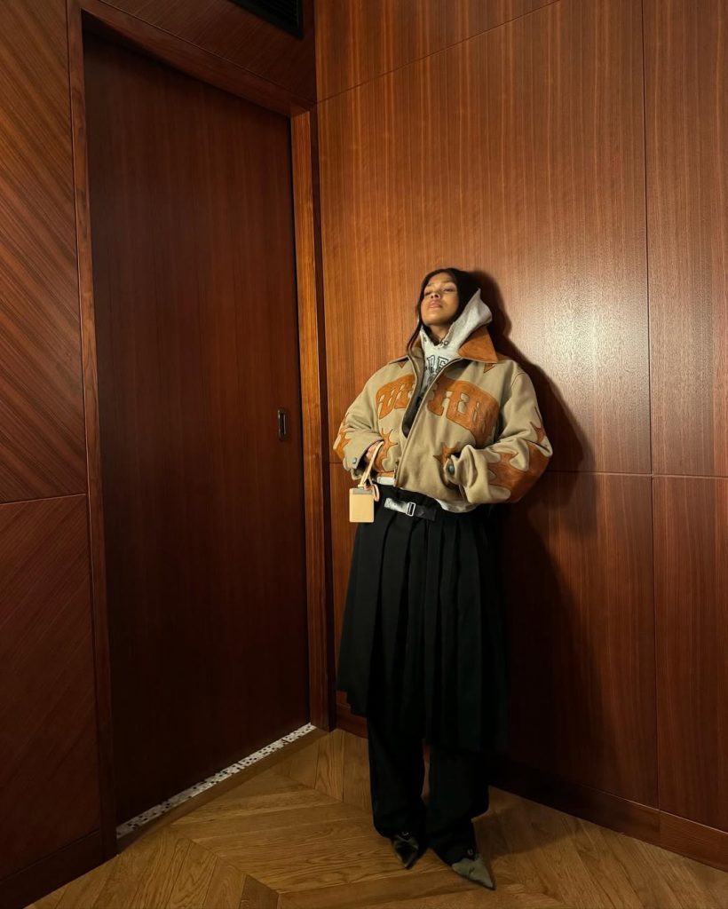 Vandaag ontvouwt layering zich in twee duidelijke benaderingen. Enerzijds zij die harmonie nastreven: een coherent silhouet opgebouwd uit tijdloze stukken in neutrale tinten, waar de risico’s beperkt blijven. Anderzijds de liefhebbers van contrast, duidelijk schatplichtig aan Y2K, die materialen en kleuren mixen zonder angst voor frictie.