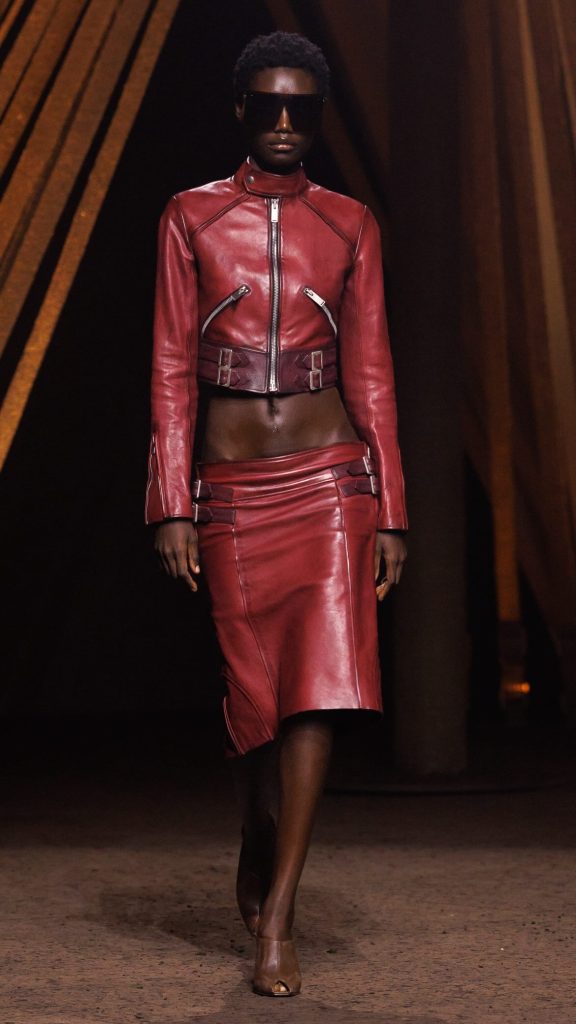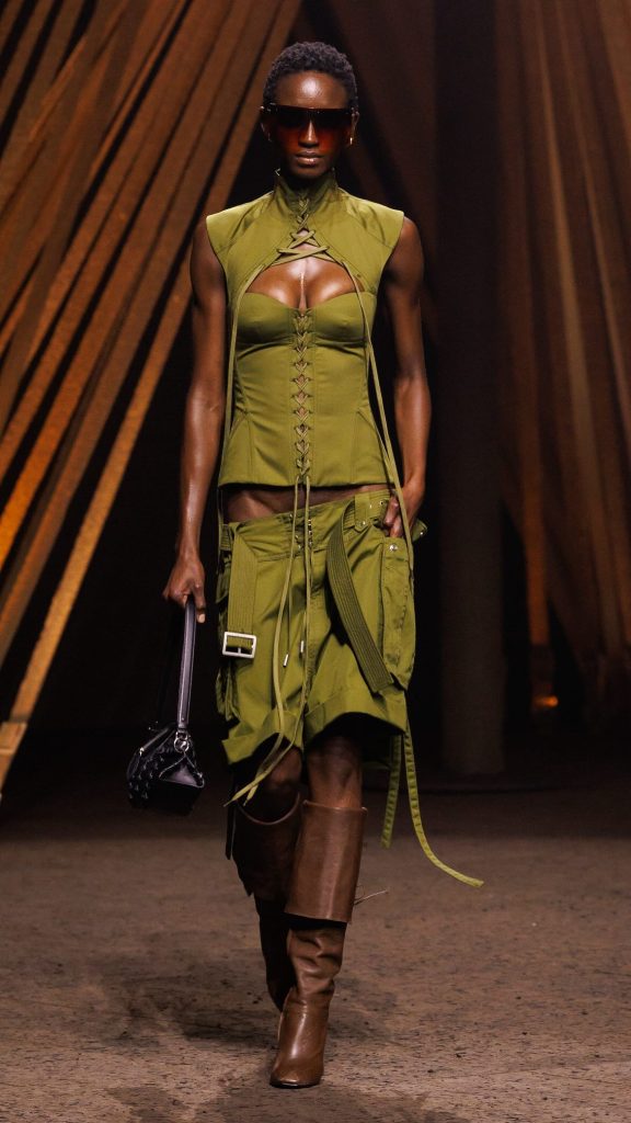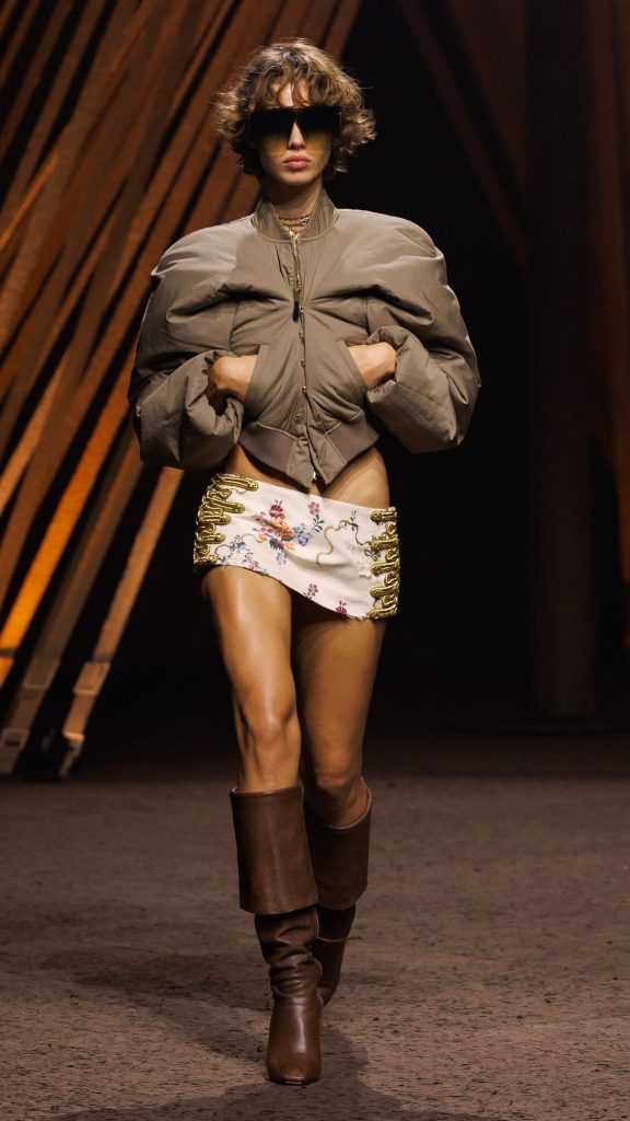 Een van de sterkste visuele accenten op de catwalk: de string, bewust hoog gedragen en zichtbaar boven de lage taille van de broek. Een directe provocatie, verheven tot couture-versie. Nog een knipoog naar Y2K’s hyperseksualisering: minirokken amper breder dan een riem, in de geest van degenen die de afgelopen seizoenen bij Diesel populair werden.