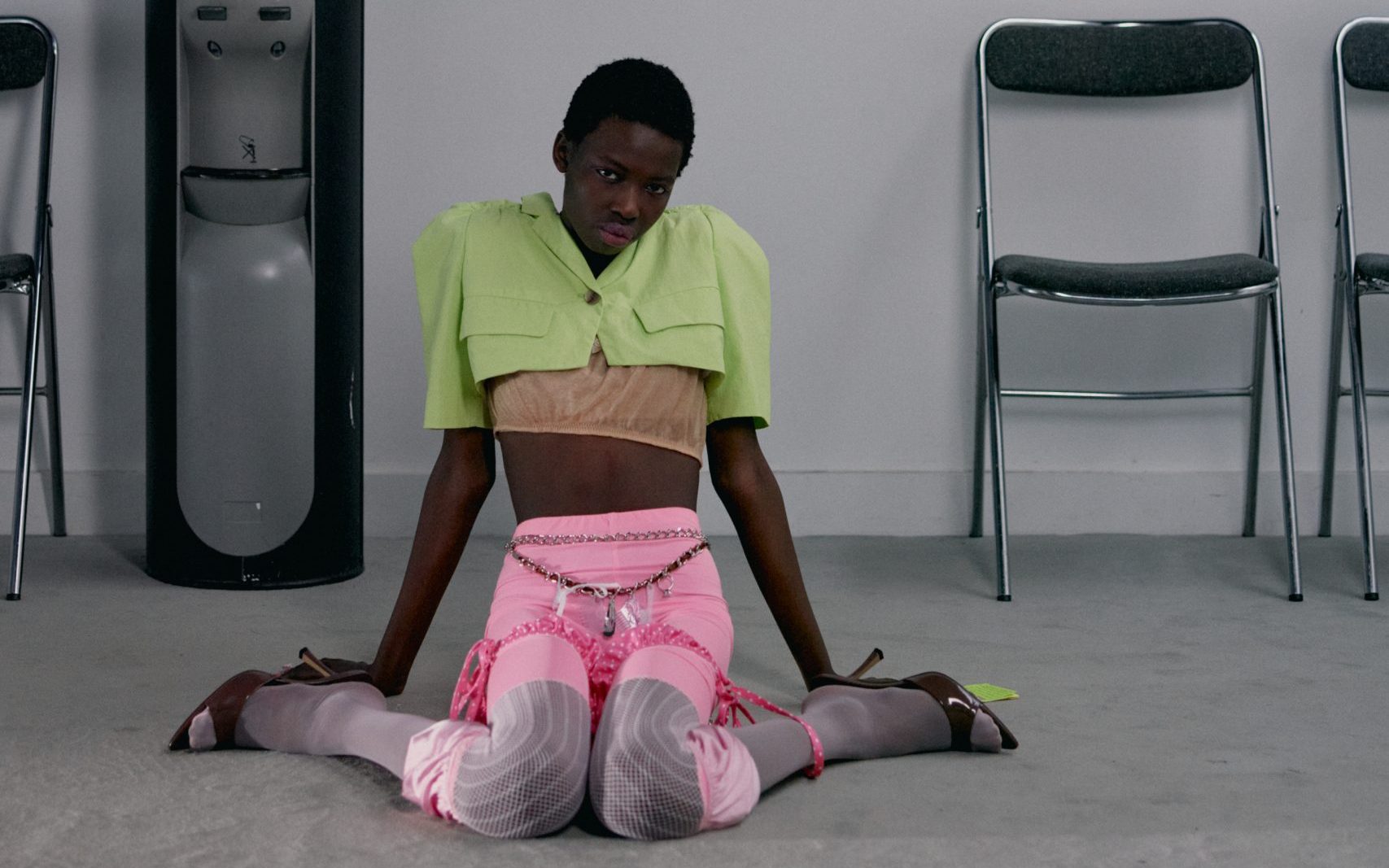 Het geheel ademt een indie-sleaze sfeer waarin Y2K-codes met ironie herwerkt worden: druipend zwarte eyeliner, officierjasje direct op de huid gedragen, een haast nonchalante, licht provocerende attitude. Een vrije vrouwelijkheid, spottend met conventies.