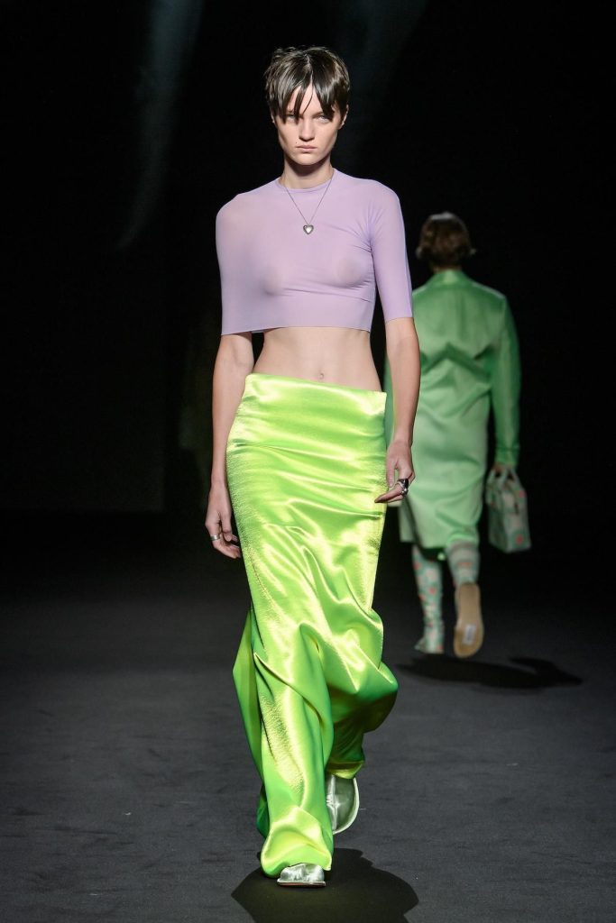 Anderen kiezen voor een subtielere benadering via de nagels. Een felgele manicure, een neonroze French of een grafisch motief volstaat om een cunti cunta-accent toe te voegen. En voor de meest gedurfden blijft het statement piece de ultieme introductie. Denk aan een gedrapeerde rok in radioactief oranje, een tweede-huid-top in zuur groen of een nylon parka in elektrisch blauw, in de geest van Demna bij Balenciaga.