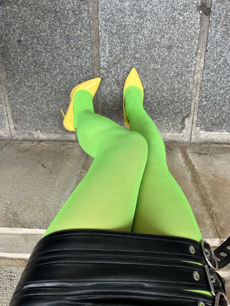 Voor wie nog twijfelt, vormen details een ideale instap. Sommige silhouetten komen tot leven met een paar limekleurige sokken of een zuurgeel panty. Het influencerduo Manon en Lilas verwerkt regelmatig fluo in hun looks, onder meer door te spelen met de trend van zichtbare kousen.