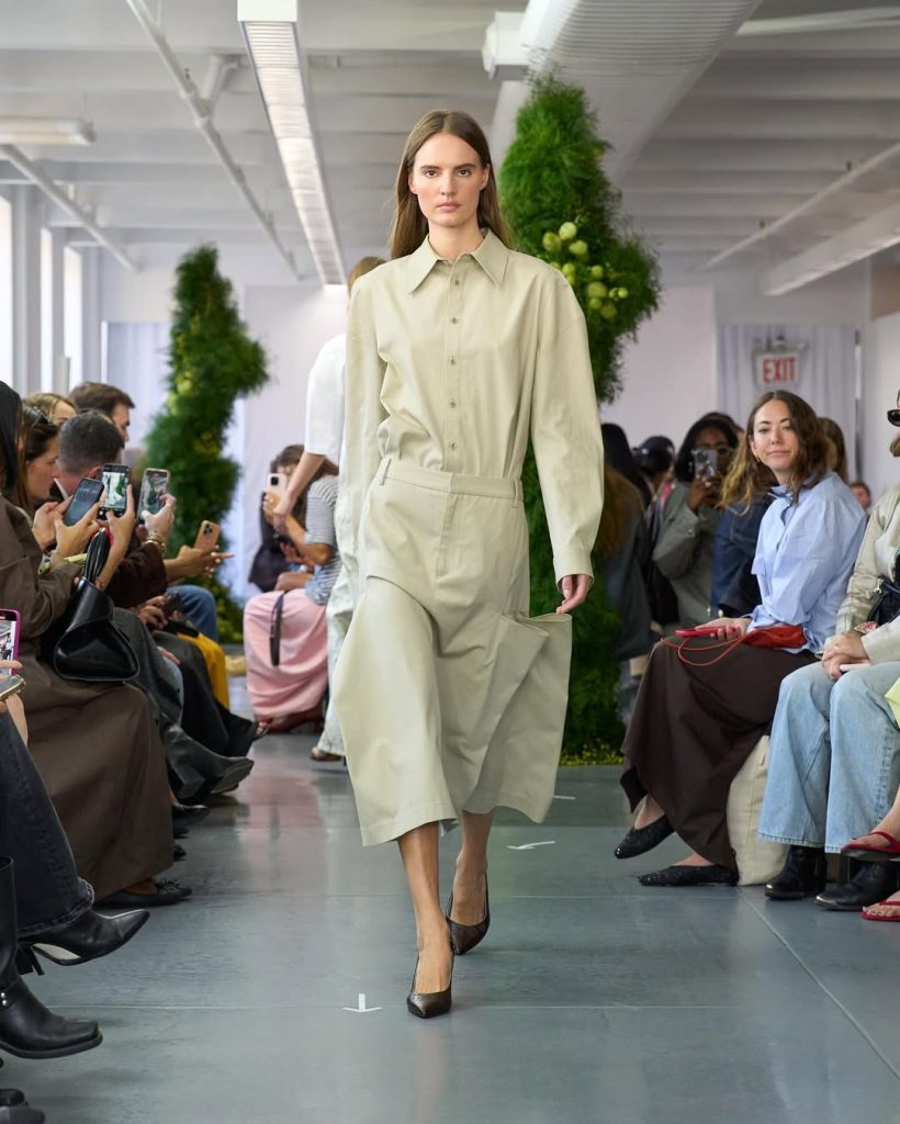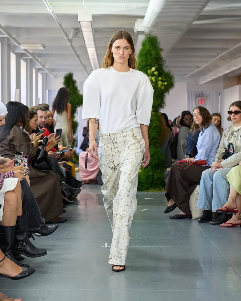 In een industrie waar het razende tempo vaak de vorm bepaalt, maakten meerdere huizen van precisie een statement. Bij Khaite passeert elk kledingstuk nog altijd door de handen van creatief directeur Catherine Holstein voor goedkeuring. “I’m a big believer that your best marketing tool is good product”, verklaarde ze aan WWD. Een credo dat letterlijk wordt toegepast. Collina Strada, doorgaans exuberant en uitgesproken, stripte deze keer alle overtollige effecten weg en werkte met identieke patronen in verschillende kleuren. Zonder de afleiding van kleur werd de puurheid van snit en volume nog duidelijker zichtbaar.