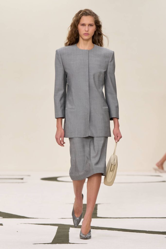 Bij Calvin Klein wordt grijs zelfs de grondstof van de look: vertaald in een recht, sober pak, combineert het moeiteloos met levendigere tinten. In de meest minimale combinaties werken deze kleuren als visuele hoogtepunten: een lavendelkleurige clutch op raw denim, een mosterdblouse onder een diepzwarte jas, een krijtwitte overhemd onder een chocoladekleurige mantel. Een garderobe die een discreet maar scherp gekleurd minimalisme uitdraagt.