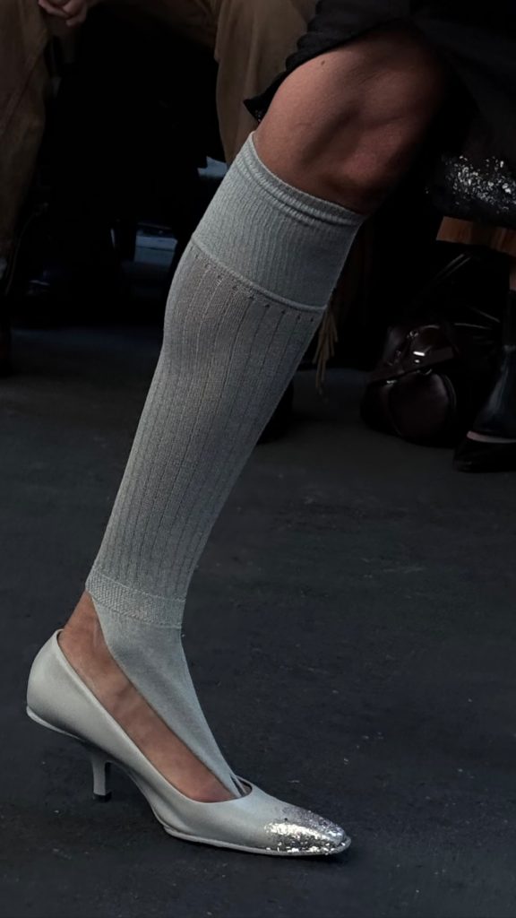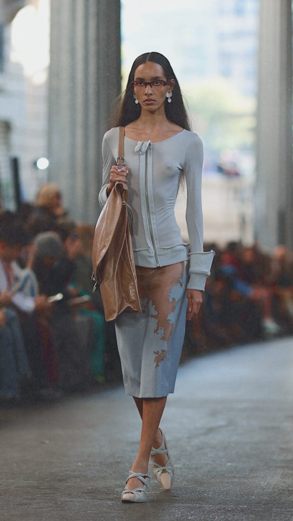 De collectie, getiteld Quick Change, zegt alles. Modellen leken halverwege het aankleden betrapt: rokken vast in lingerie, glitters nog zichtbaar op de huid, T-shirts half aangetrokken. Sommige corrigeerden hun outfit live, lieten een mouw zakken of schoven lagen om. Bh’s boven shirts, stomerijhoezen als XXL-tassen: een esthetiek van de onderbroken, bijna gestolen beweging. Een ironische knipoog naar de “clean girl” trend en haar fixatie op perfectie – hét schoonheidsideaal van begin dit jaar.