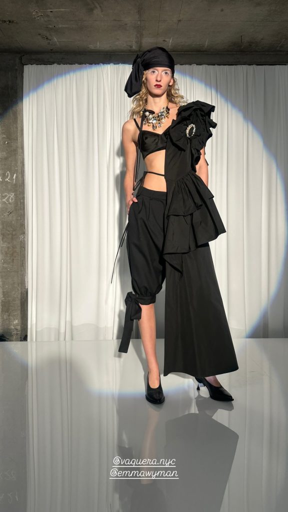 Dit seizoen zijn de contrasten intenser dan ooit: vloeiende, gedrapeerde jurken botsen met rigide crinolines, soms zichtbaar gelaten, waardoor een subtiele spanning ontstaat tussen structuur en beweging, ondoorzichtig en transparant. Zelfs de make-up ademt een achttiende-eeuwse grandeur. Ook het casting trok de aandacht: de verschijning van onder meer Nicky Doll bevestigt de inclusieve, speelse energie die Weinsanto wil uitstralen – een boodschap die nog altijd brandend actueel is binnen de mode.