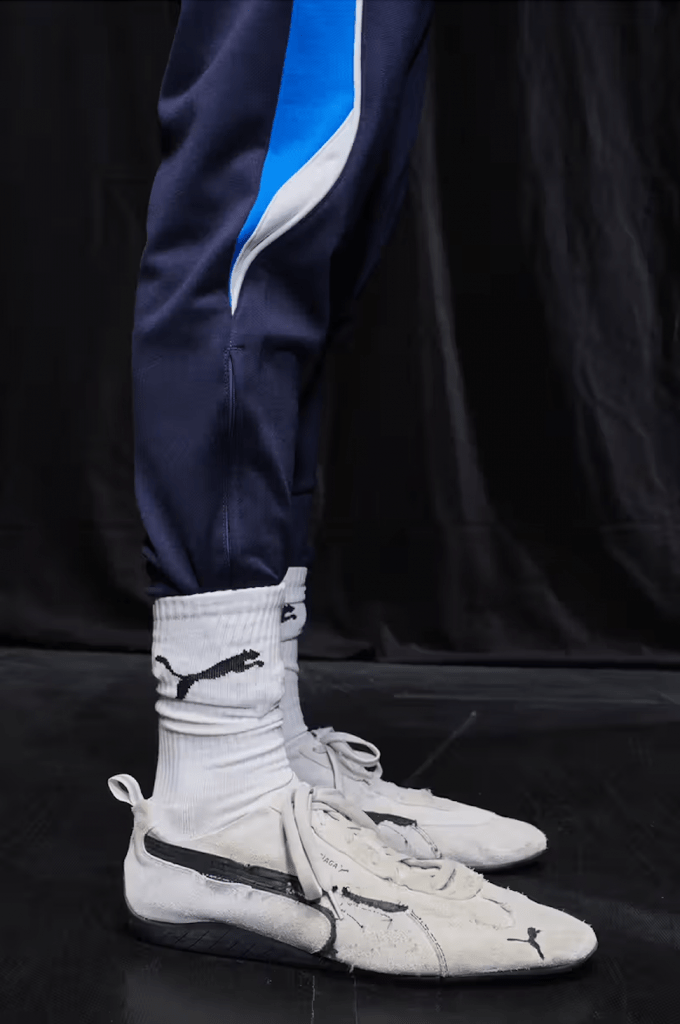 Ook Demna, voormalig creatief directeur van Balenciaga, adopteerde de Speedcat voor zijn collectie “Standard”. Hij gaf de sneaker een licht verstoord uiterlijk, inclusief een subtiel verdwenen Formstrip, en combineerde hem met retrovoetbaljoggings — een andere sporttak die nauw verweven is met Puma.