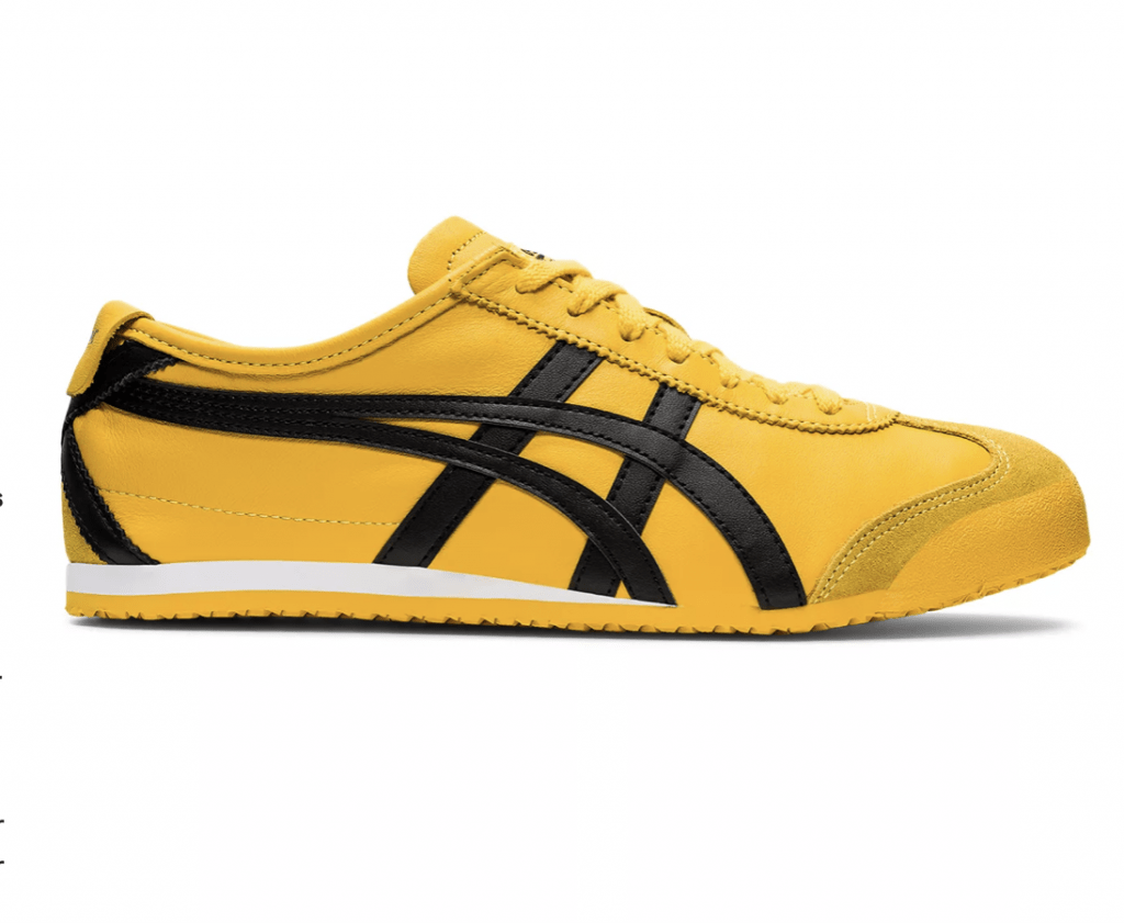 Kleuren spelen een cruciale rol in de visuele identiteit van een sneaker. Sommige merken houden vast aan neutrale en klassieke tinten, terwijl anderen kiezen voor felle kleuren of opvallende combinaties. De Air Jordans bijvoorbeeld zijn iconisch geworden dankzij de bekende “Bred” (black + red) kleurstelling, die al snel uitgroeide tot een tijdloze klassieker. Ook de Onitsuka Tiger Mexico 66 is legendarisch geworden door het geel met zwarte strepen, vooral dankzij Bruce Lee’s optreden in Game of Death en Uma Thurman in Kill Bill.