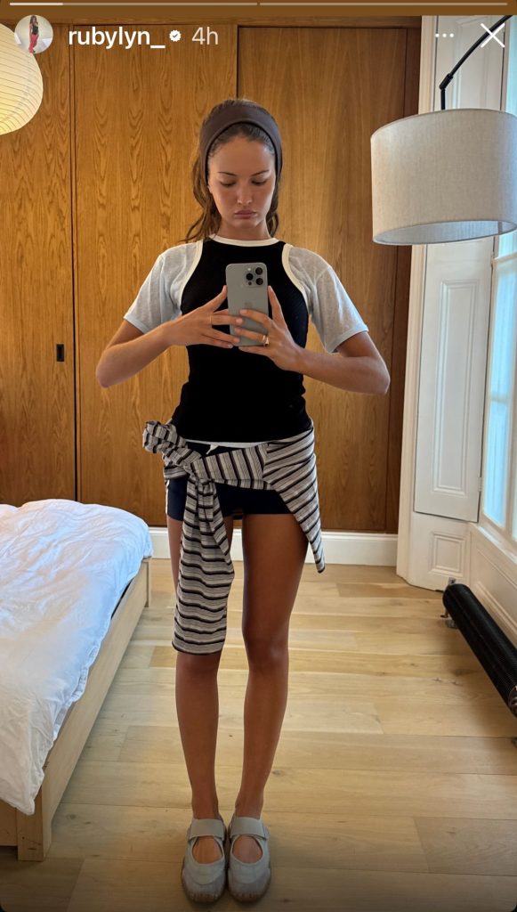 Schoenen maken nu het verschil. Sneakers houden het silhouet uitgesproken sportief. Hoge UGGs schuiven het beeld richting achteloosheid, alsof men aantrok wat voorhanden was. Laarzen of hakken verstoren het signaal bewust. De outfit zegt niet langer fitnessruimte, maar keuzevrijheid. Het gaat niet meer om het tonen van een ideaal lichaam of levensstijl, wel om het innemen van een persoonlijke positie. Soms speels, soms kritisch tegenover gevestigde codes.