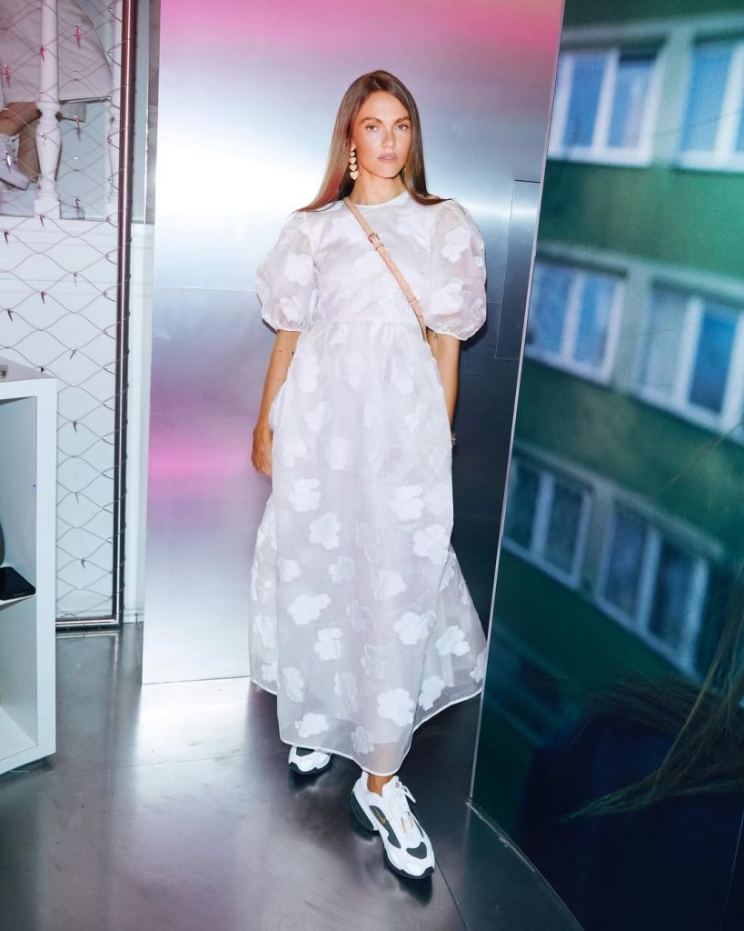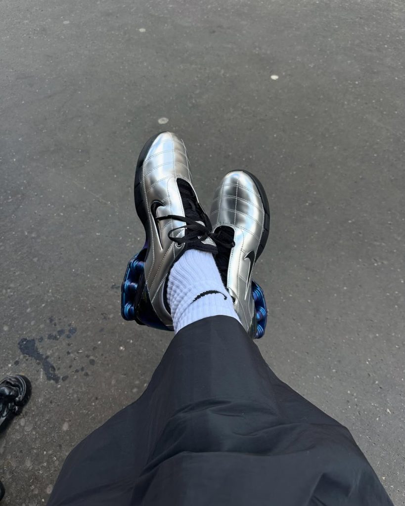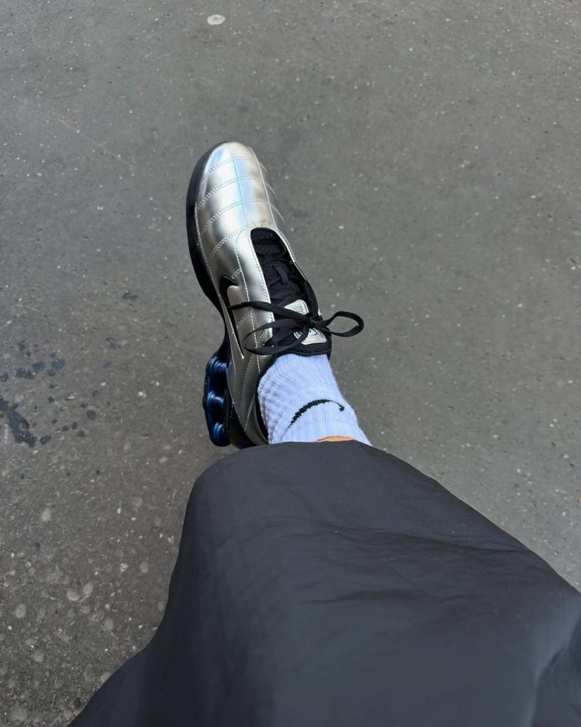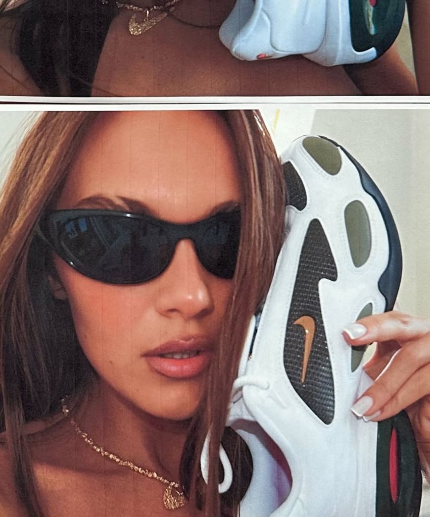 Ze wisselt af tussen uitgesproken vrouwelijke stukken — mini-shorts, hoge hakken, nauwsluitende jurken — en oversized streetwearitems, vaak geleend uit de mannelijke garderobe. Die dualiteit vormt een krachtig silhouet, vol zelfvertrouwen. Ook haar scherpe sneakercollectie is legendarisch: vaak vintage, altijd vooruit op de trends. Eén van haar laatste obsessies: een paar Total 90 Magia’s in metallic grijs met elektrische blauwe luchtbellen — een knipoog naar het voetbal van de jaren 2000.
